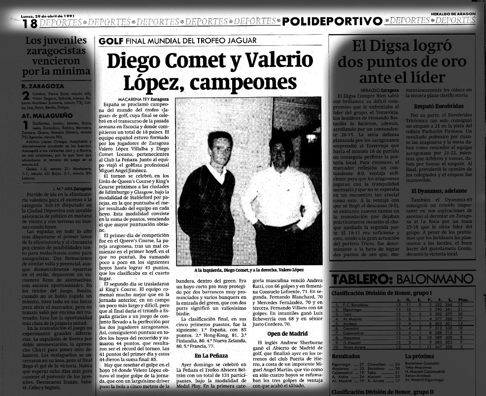 La semana pasada se cumplió una de esas efemérides. Tal día como el domingo 26, pero en 1991, dos socios de La Peñaza, Diego Comet Lozano y Valero López Villalba (fallecido en 2017), se proclamaron campeones de la final mundial del Jaguar Golf Days. La prueba se celebró en Gleneagles, un campo histórico que ha acogido el Open de Escocia, pruebas de la PGA, del European Tour, la Solheim Cup de 2019 o la Ryder de 2014.